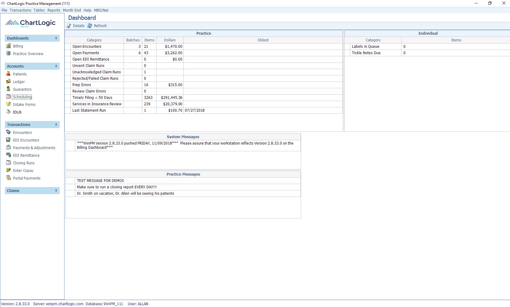Beyond revenue enhancement, Chartlogic offers an appointment scheduler, which can correlate individual practitioners’ schedules. The reporting systems give managers workflow analysis as well as options to easily track the financials of the practice. ChartLogic Practice Management creates an ‘at a glance’ summary of the demographics of a practice, which allows for easy reporting and financial planning.