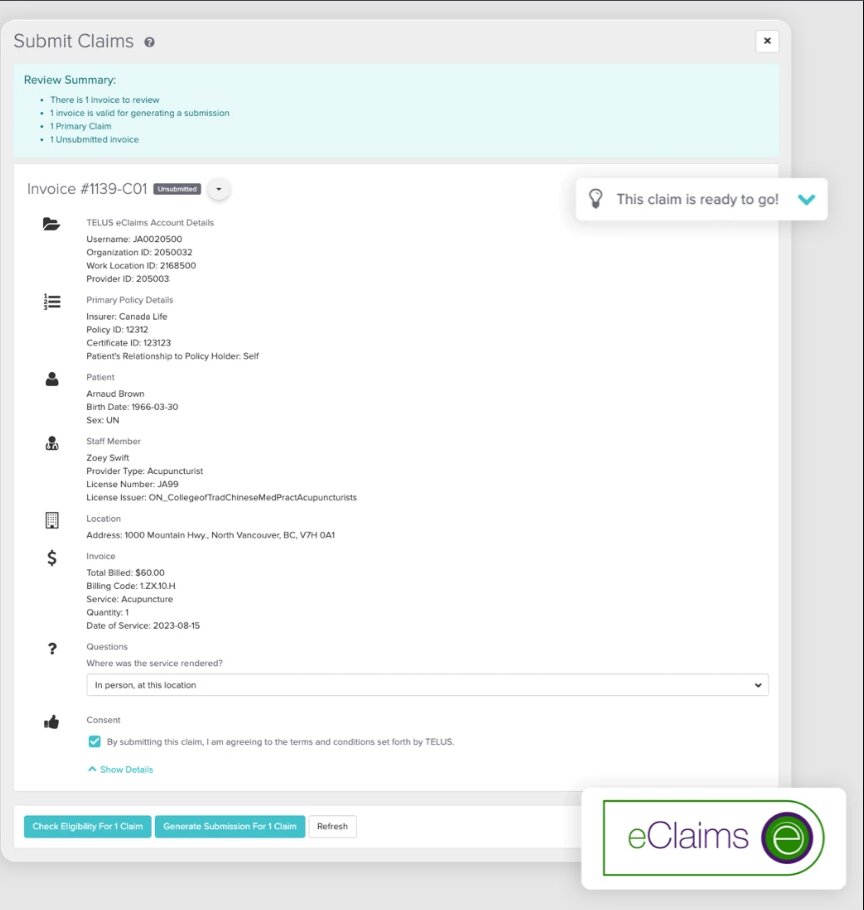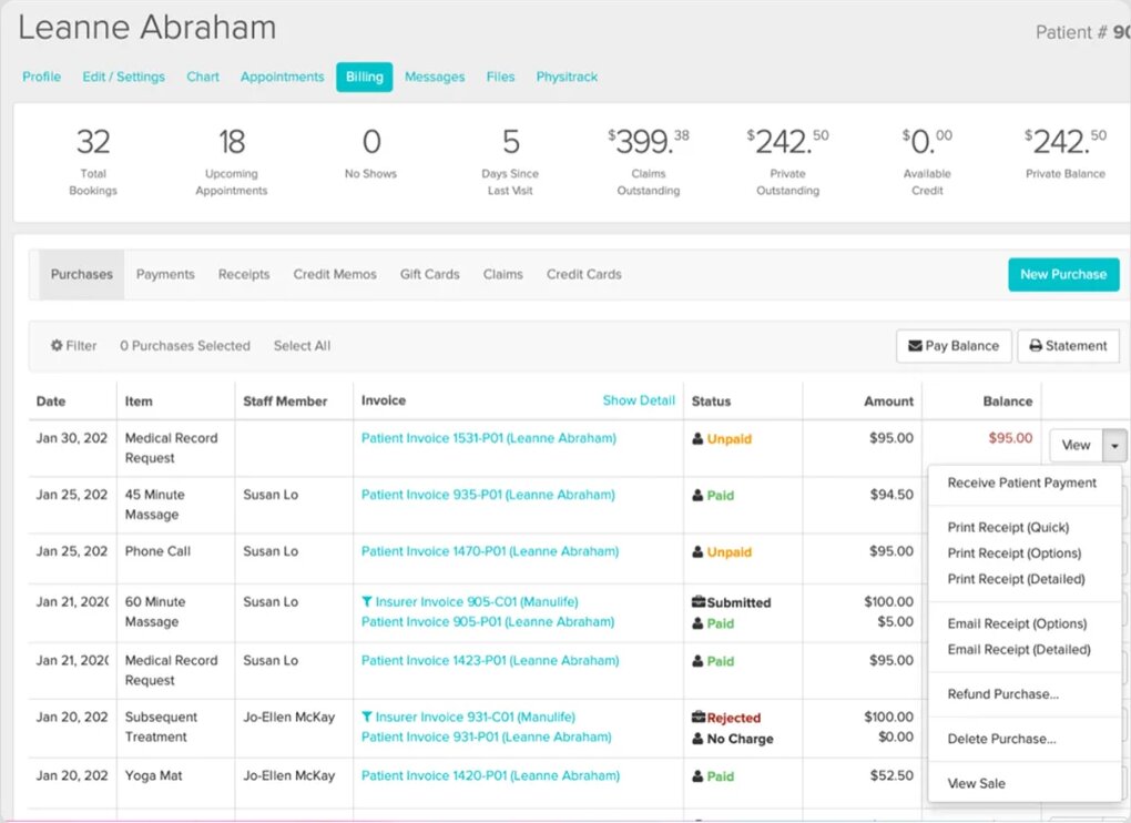 - Billing and payments. Invoicing, receipt handling, integrated in-app payments, and optional insurance-billing features that support a growing list of payers.