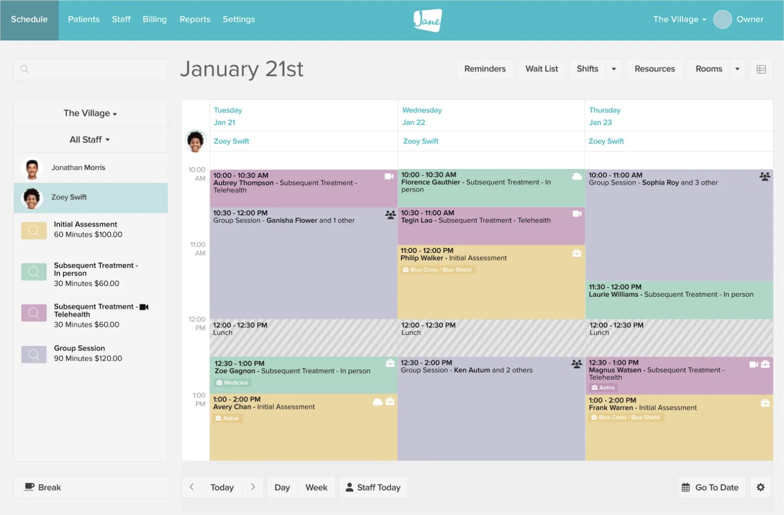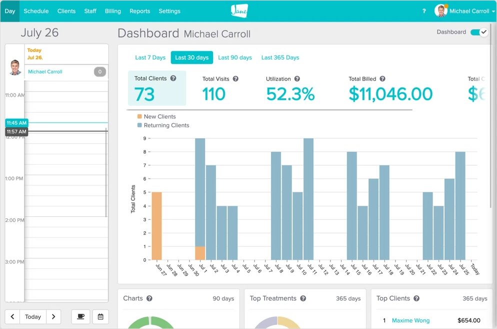 Jane is a cloud-based practice management platform built for allied health and wellness clinics. It combines online booking, staff scheduling, charting, payments, billing, telehealth, and patient communications in one product aimed at small to mid-size clinics and solo practitioners.