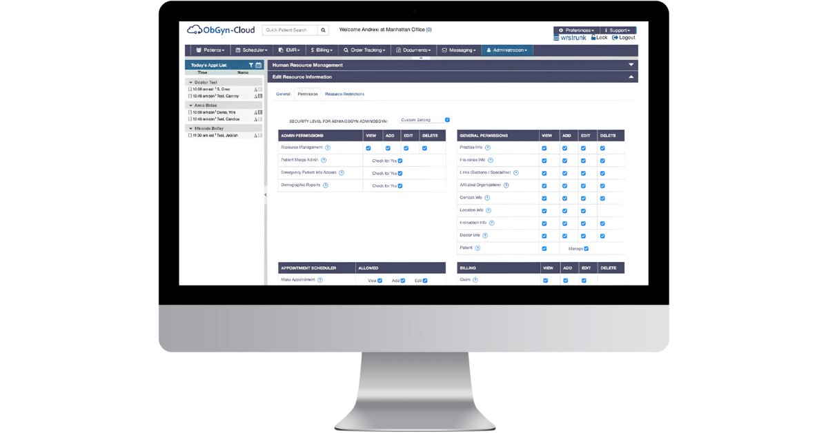 Beyond clinical documentation, ObGyn-Cloud includes a full suite of practice management tools natively integrated with the EHR. Appointment scheduling is flexible and customizable, allowing the creation of different visit types (annual exams, new OB intake, procedures, etc.) with adjustable time slots to reflect the practice’s workflow.