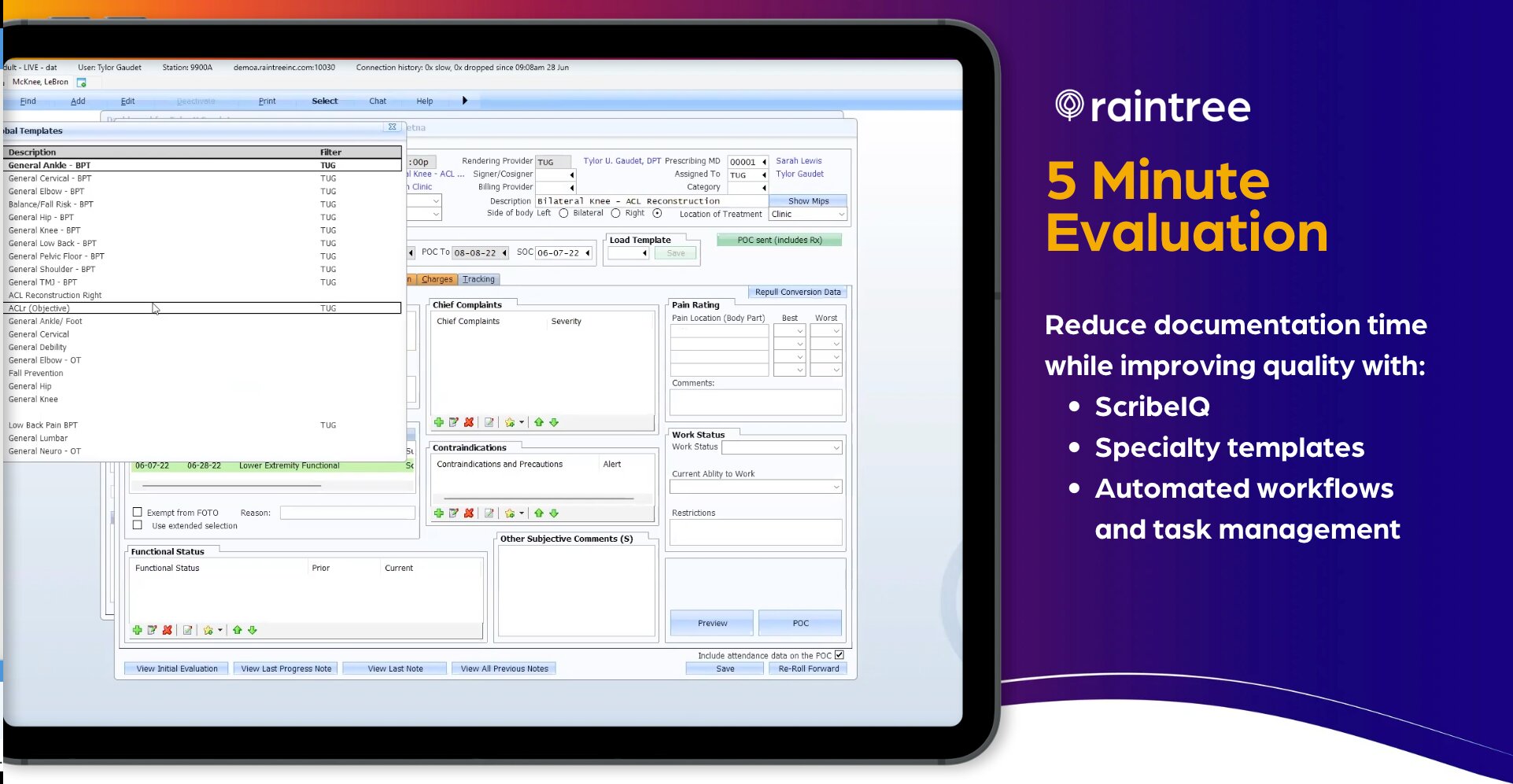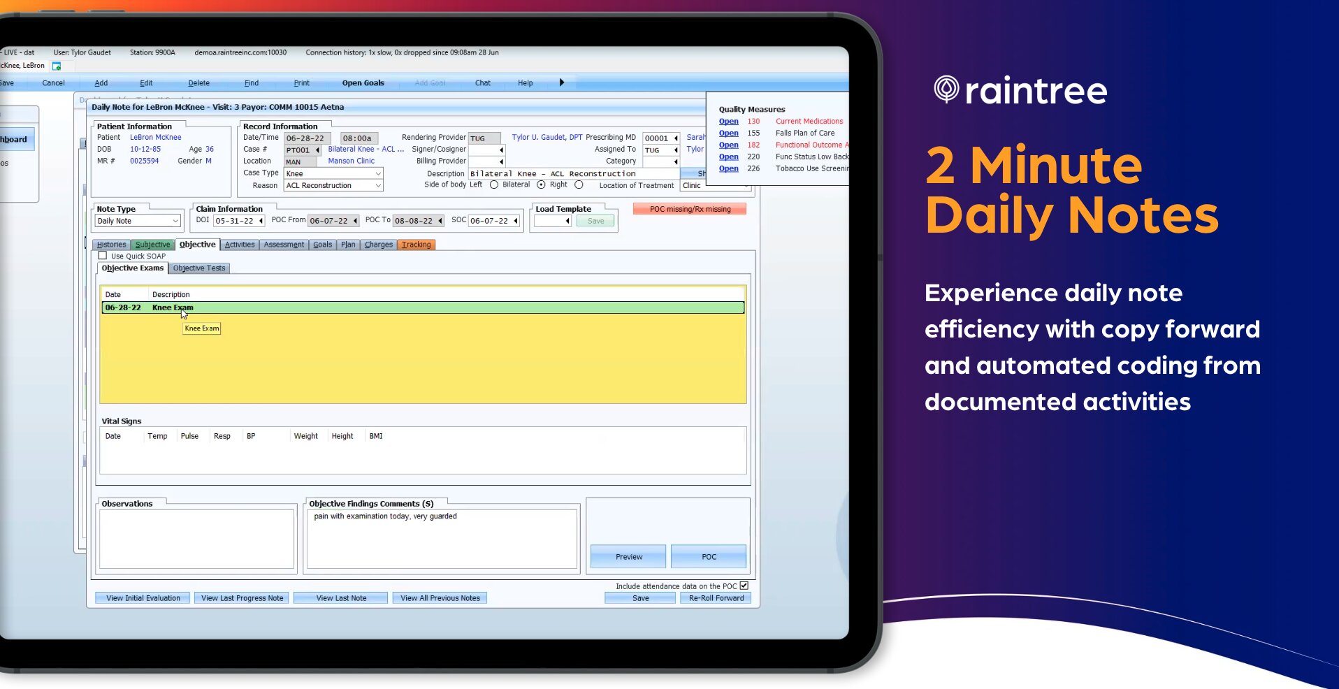 Raintree is the rehabilitation and physical therapy software of choice for enterprise and large therapy provider organizations, managing more than 50 million patient visits annually across 8,500+ therapy clinics nationwide.
