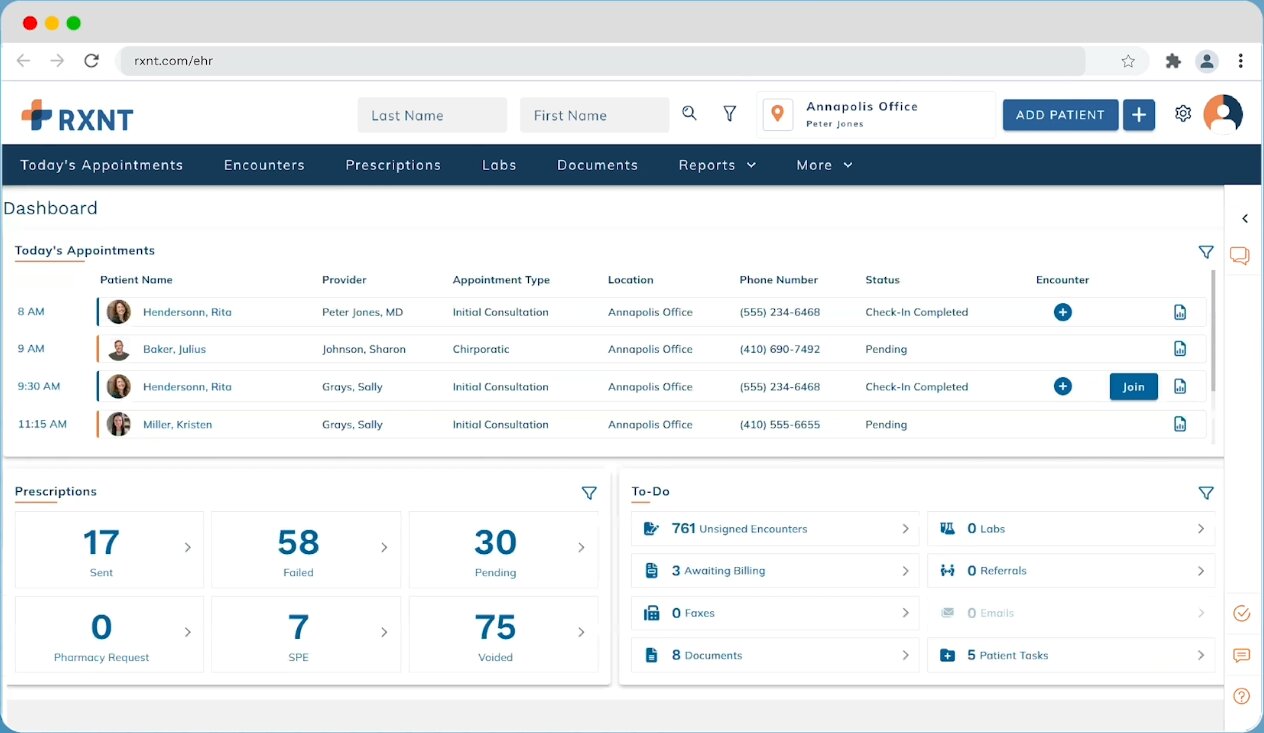 RXNT's integrated, cloud-based Electronic Health Records (EHR) solution helps practices of all sizes and specialties, from small family practices to large multi-location physician providers across the United States. Our EHR optimizes patient care and streamlines workflows, allowing real-time health and prescription history at the point of care. It's HIPAA compliant, Surescripts compliant, satisfies MACRA, and is both MIPS- and ONC-certified.