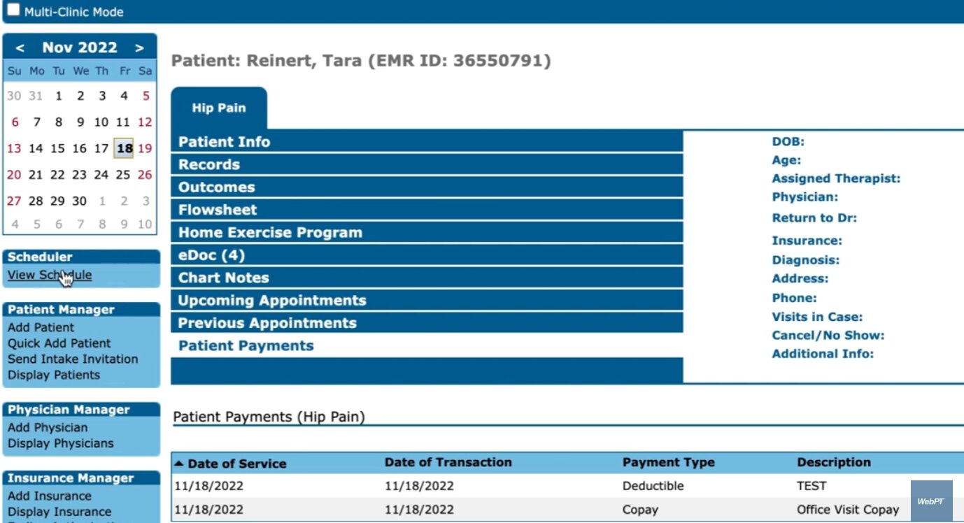 Unlike other EMR systems, WebPT has a design specifically tailored for therapy, allowing users to schedule, document, and bill patients without concern for hardware or software upgrades. It includes an integrated, multi-user scheduler; automated appointment reminders; an external document uploader; and a suite of reporting tools to track everything about patients and patient demographics.